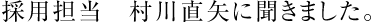 最初から私、村川がみなさんにお会いし、 ブレないトーンで、お互いの相性を確認していきたいと思っています。 入社までの間に何回も会っていただくことになります。 きっとそんな過程で、本音で語り合える関係になるでしょう。